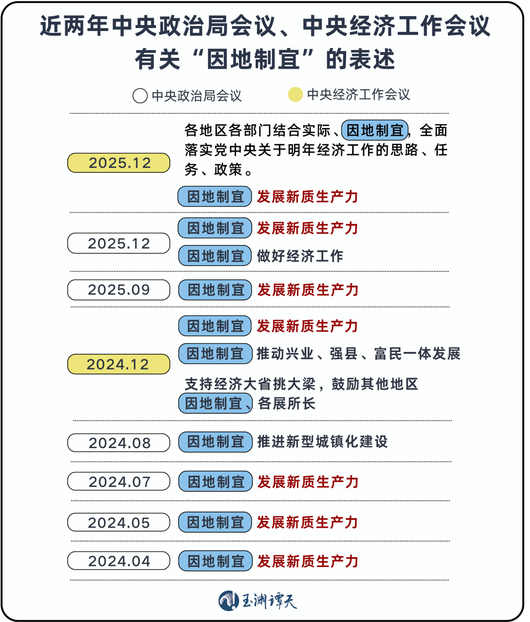 谭主梳理了近两年的中央政治局会议和中央经济工作会议,可以看出近两年,跟“因地制宜”搭配最多的词,是“新质生产力”,而2025年底中央政治局会议,更是从做好经济工作的维度,对因地制宜进行了阐述。