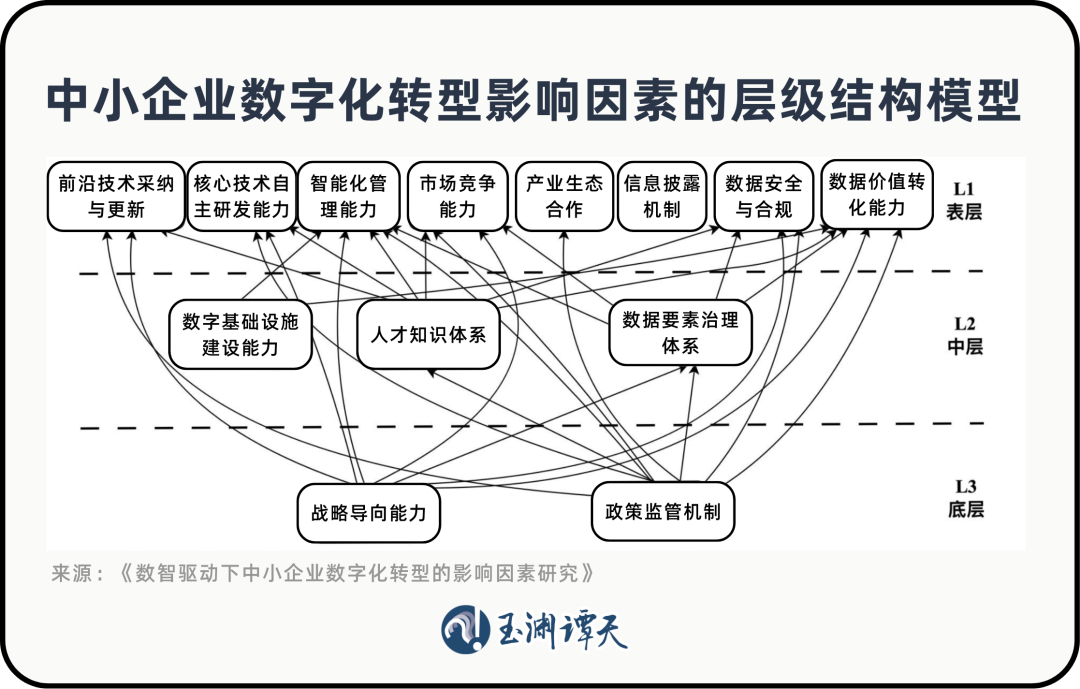 有关研究对数字化转型的关键要素做了一个结构化分析,其中企业自身的战略导向能力,以及政策监管机制,这两件事决定了转型能不能启动、能不能持续推进。